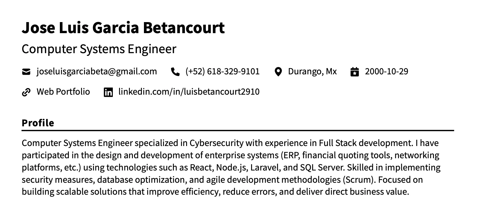Ingeniero en Sistemas Computacionales con especialidad en Ciberseguridad y desarrollo Full Stack. Experiencia diseñando sistemas empresariales (ERP, plataformas financieras, networking) con React, Node.js, Laravel y SQL Server. Enfocado en crear soluciones escalables, seguras y de alto impacto bajo metodologías ágiles.